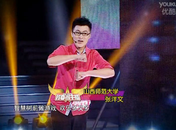 在历经海选赛、晋级赛、导师考核赛,半决赛等诸多赛事后,张洋文同学过五关,斩六将,通过了层层筛选成功闯入十强决赛。面对决赛中强劲的比赛选手,他与和来自上海戏剧学院的搭档共同完成生活服务类的节目《快乐生活一点通》与看图说话,以其激情真挚、得体大方、机智灵敏的出色表现获得评委老师的一致肯定,最终获第三名的优异成绩。