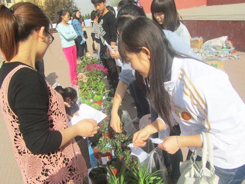 本次活动主题为"绿满身边",旨在增强当代大学生环保意识。活动面向全校学生。在现场,同学们用日常积攒的空瓶换取自己喜欢的植物,志愿者成员也在认真清点空瓶和植物数量,整个过程井然有序,气氛十分热烈。