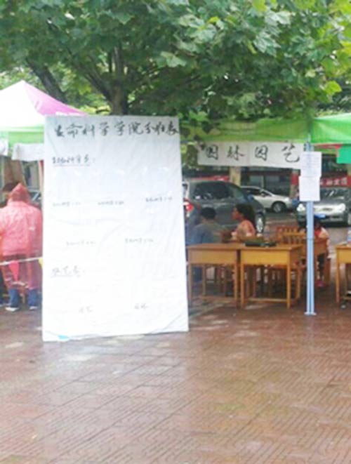 在学院迎新接待点,学生会特别设立了一个手工制作的分班大版面,用于公示14级所有学生的分班名单,确保每一个前来报到的新生都能在第一时间查询到自己的班级,尽快排队办理各种手续。这样既方便了新生报到也提高了工作效率。