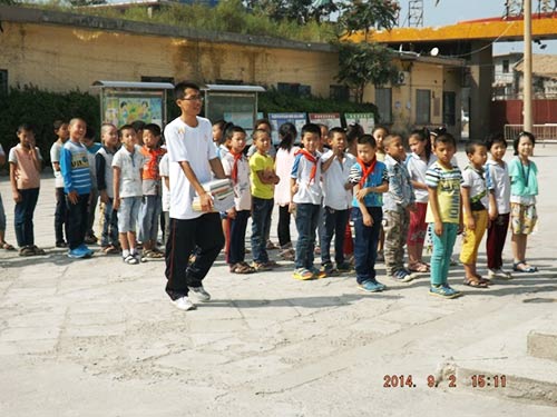 志愿者用空瓶换绿植所得的钱购买的学习用品去看望农民工子弟小学的小学生,分发学习用品的同时给他们讲授绿色环保知识,传承环境文明精神,并与他们互动游戏,同学们积极参与表现出极大的热情,现场气氛热烈。