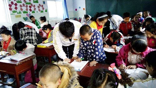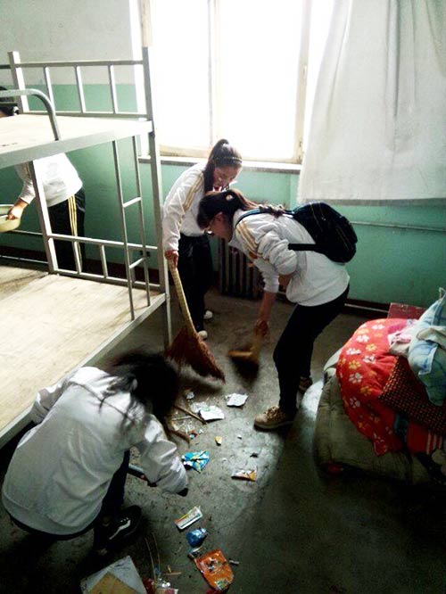 在农民工子弟小学,志愿者发现学生即将入住的宿舍不够卫生,就主动与校方商量,先帮助清扫宿舍卫生,在清扫过程中,志愿者不怕脏不怕累,仔细清扫床铺,擦拭玻璃和窗台,并细心地为孩子们铺床,用自己的爱心为孩子们创造一个整洁舒适的家。随后,志愿者走进教室,走到孩子们身边,辅导他们写作业,孩子们积极提问,将自己不懂的画出来,志愿者认真解答,耐心指导,尽显师范人风采。短短一个下午,孩子们已经也对志愿者产生好感,有些还进行了深层次心理交流,现场气氛十分融洽。