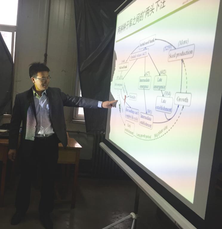 首先由返校博士高瑞如老师开讲,题目为 “毛乌素沙地一年生植物生活史重要阶段对气候变化的响应机制”。高博士以沙蓬为例,详细阐述了毛乌素沙地一年生植物种子库对温度、降水变化的响应,沙蓬通过萌发物候异质性调节幼苗出现时间,进而影响其存活和结实,以此来应对早春霜冻和季节性干旱等不利条件的影响。在未来气候变化背景下,沙蓬通过生活史各阶段的多种对策来应对半干旱区温度和水分变化,从而使其种群能够得以维持、更新和发展。
