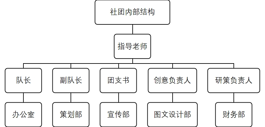 绿色先锋队设立队长、副队长、团支书、创意负责人以及研策负责人,向下分设财务部、办公室、图文编辑部、策划部以及宣传部。